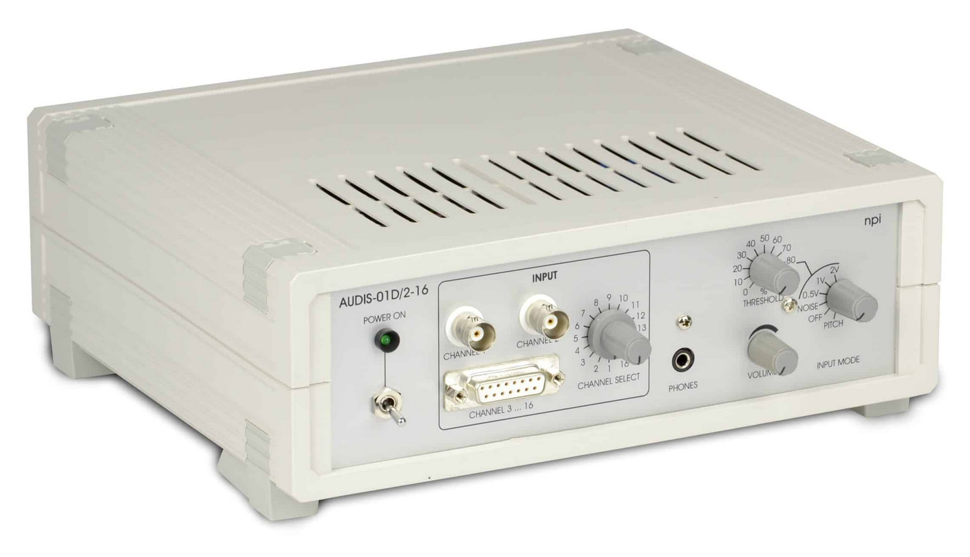 The AUDIS-01D/2-16 serves as a digital acoustic monitor housed in a compact desktop cabinet, featuring a built-in loudspeaker and two distinct audio modes. In PITCH mode, the voltage input signal is transformed into a tone, while in NOISE mode, the signal undergoes highpass filtering to facilitate noise monitoring. A THRESHOLD function (available in NOISE mode) can be employed to mask the baseline noise.