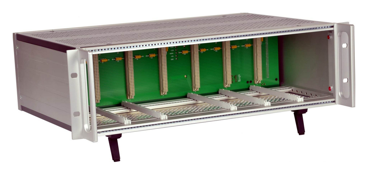 This system is contained within a 19" rackmount cabinet (3U) that includes a power supply and accommodates up to 7 plug-in units, depending on the module width.