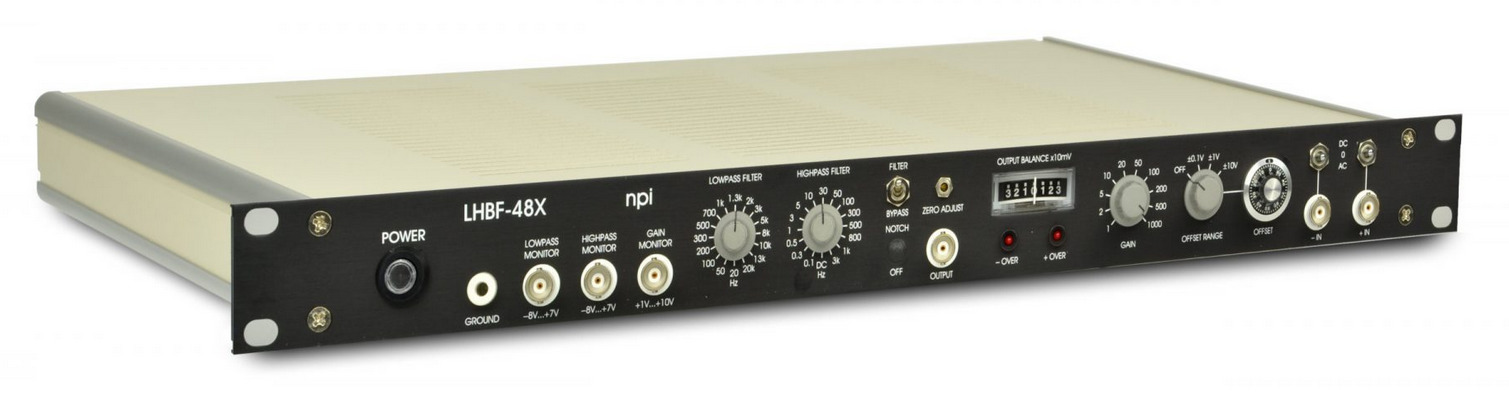 The LHBF-48X amplifier/filter is specifically engineered for the processing of small bio-electrical signals. This unit includes a differential input stage with an AC/0/DC switch for each input. Following the input stage, there is offset compensation, a GAIN stage (providing amplification from 1 to 1000), a HIGHPASS filter (a one-pole Bessel filter with 15 corner frequencies and DC), and a LOWPASS filter (a four-pole Bessel filter with 16 corner frequencies).