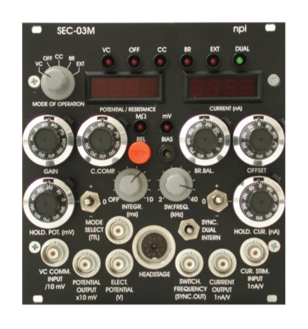The SEC-03M is a switched mode single electrode voltage and current clamp amplifier module designed for recordings utilizing sharp microelectrodes or suction (patch) pipettes.